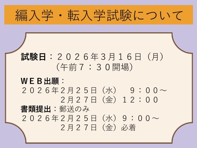 3月16日(月)実施 編入学・転入学試験について