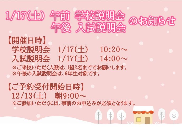 【受験生向けイベント情報】1/17(土)第5回学校説明会・第2回入試説明会のお知らせ