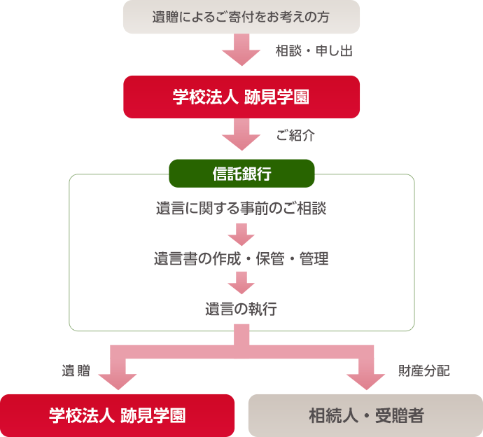 跡見学園では、遺贈の形で母校に対して寄付を行いたいとお考えの方々に、信託銀行が提案する「遺言信託」制度をご紹介しております。これは、相続のトラブルをなくし、ご遺志どおりの財産分配を滞りなく実現するため、信託銀行が遺言に関する手続きを代行する制度です。