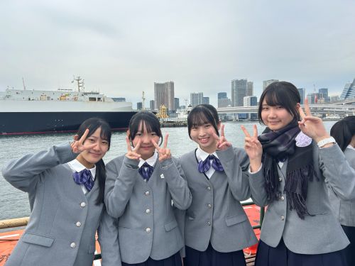 乗船を前に、期待に胸を膨らませて記念撮影。生徒たちの晴れやかな笑顔が印象的です。