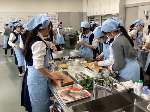 班のメンバー同士で積極的に声を掛け合い、協力して取り組む姿が非常に印象的でした。それぞれが自分の役割を責任もって果たすだけでなく、周囲の状況を見て迅速かつ安全に動くことで、実習はスムーズに進行しました。その努力もあってか大変美味しくできたようで、完成後、教室を見回る教員に対し、「私たちの班の料理が一番おいしいと思います!」、「先生、ぜひ食べてみてください!」と、あちこちから明るい声が上がりました。
