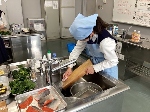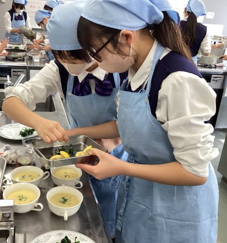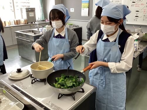 中学1学生は、家庭科の授業でこれまで学んできた調理器具の使い方や食材の知識を実践するために、調理実習を行いました。写真は2月のものです。