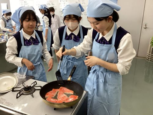 鮭のムニエルを調理しています。班のメンバーで協力し、焼き加減を確認しています。