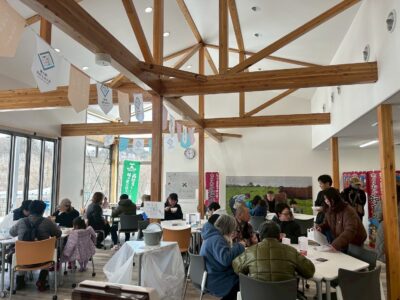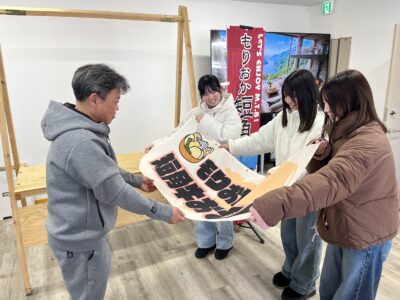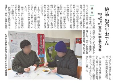 盛岡には特徴的なおでんがないこと、市民の牛肉消費量は非常に少ないことなどから、2月1日、道の駅もりおか渋民にて認知向上と牛肉消費拡大を目指した「もりおか短角牛おでん」のお披露目イベントを実施しました。 学生はおでんの企画、屋台や会場の設営、もりおか短角牛の説明リーフレット等を制作し、当日は3年生4人が受付や接客を担当しました。