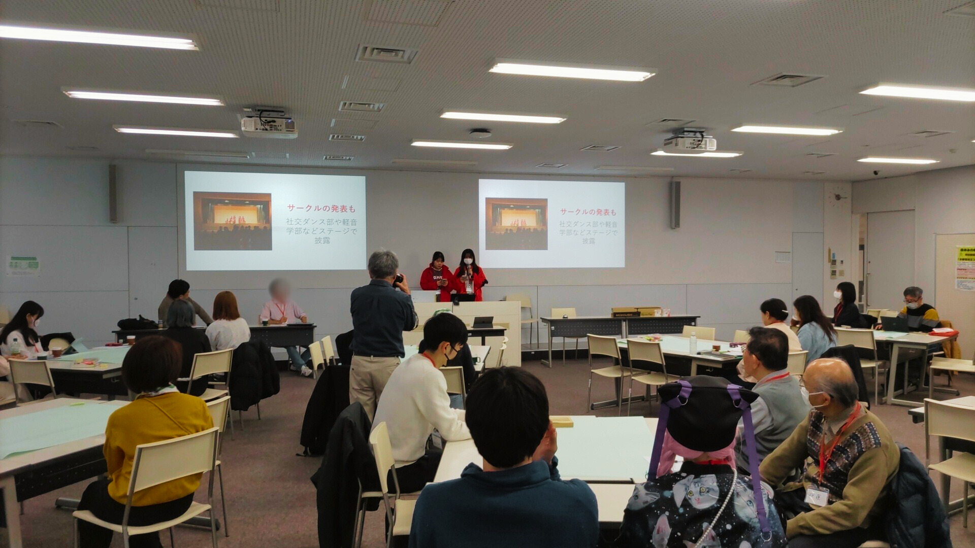今回は、午前中に「多世代まちづくり~まぜこぜ地域活動がつくる文京の未来~」をテーマにしたトークセッションが行われ、区内で活動する多様な世代の13組が登壇して、活動報告を行いました。本学からは、紫祭実行委員会が登壇しました。いくつかの団体が発表した後にはグループワークも行われ、発表内容について参加者同士で更なる情報交換が行われました。