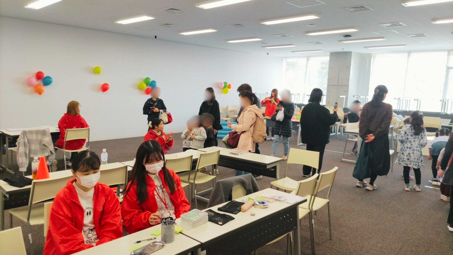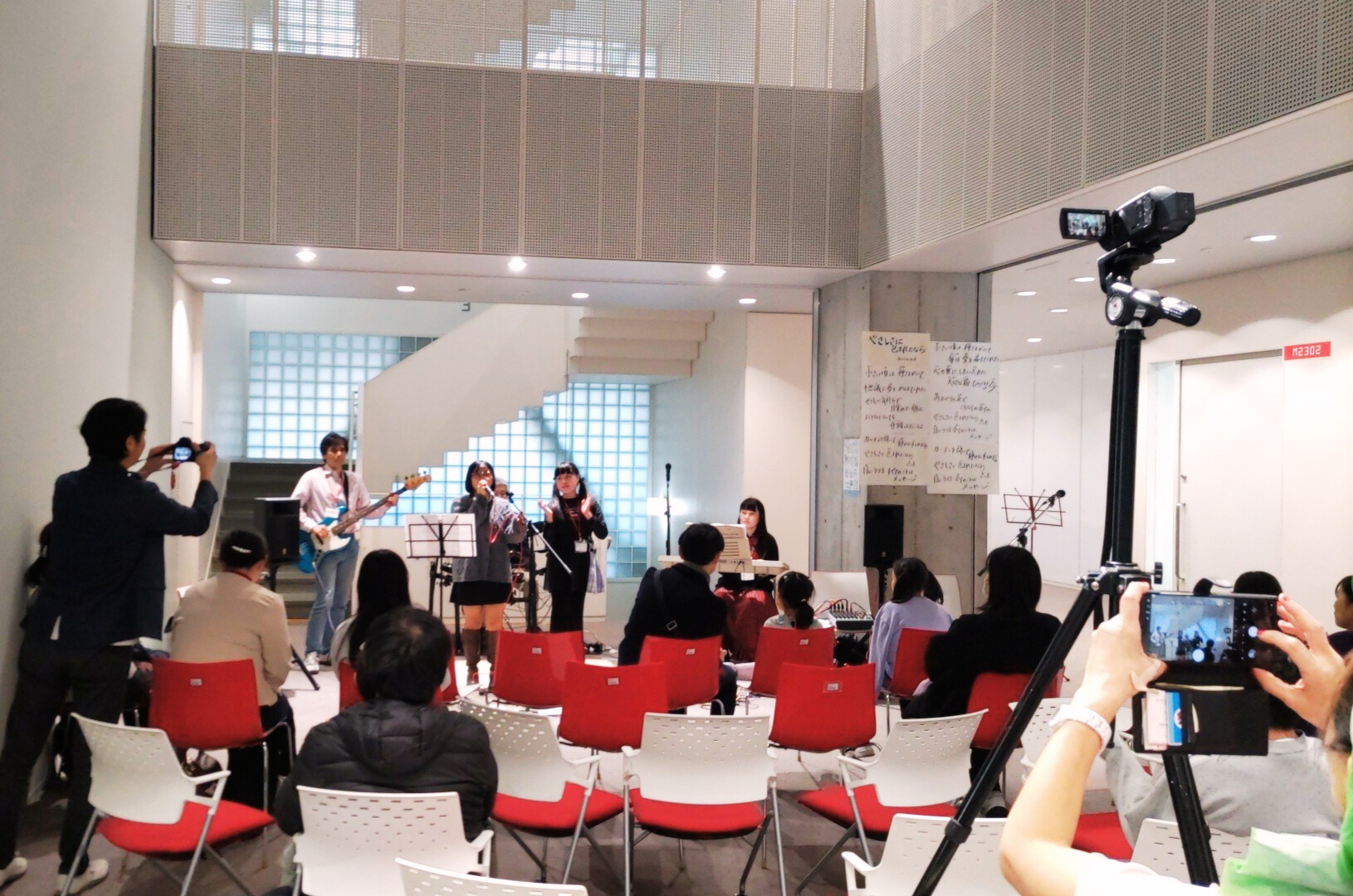 お昼からは、本学紫祭実行委員会による「子ども縁日」、墨絵アーティストによる体験が行われたほか、3階オープンスペースに設置された特設ステージにおいて、本学観光コミュニティ学部学生の司会のもとで、漫才、バンド演奏、タップダンス、盆踊りなど多様なパフォーマンスが行われました。「子ども縁日」には80組以上の親子が参加し輪投げやボーリング、お菓子釣りなどを楽しみました。イベントには総計で200名以上が参加し、グランドフィナーレでは参加者全員で「やさしさに包まれたなら」の合唱が行われ、大いに盛り上がりました。