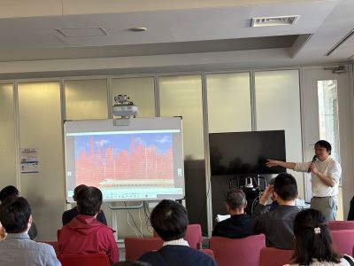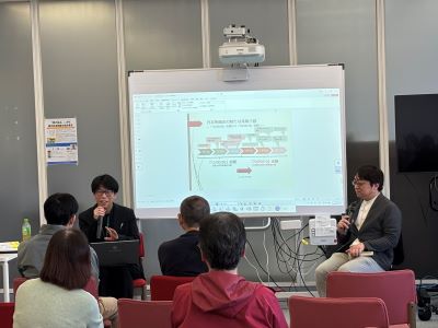 会の後半では渡邉教授と、4月に本学に着任したゲーム研究者の根岸貴哉先生の公開対談も行われました。
