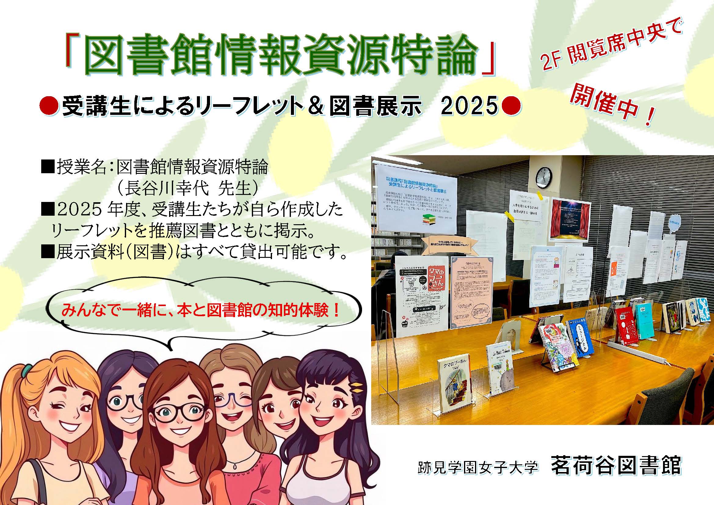 茗荷谷図書館では、現在、司書課程「図書館情報資源特論」(⾧谷川幸代先生)の授業で2025年度秋学期受講生が作成したリーフレットと図書館所蔵図書の展示を開催しています。