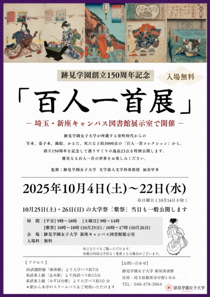 【百人一首展の問い合わせ先】跡見学園女子大学 新座図書館/TEL:048-478-3864