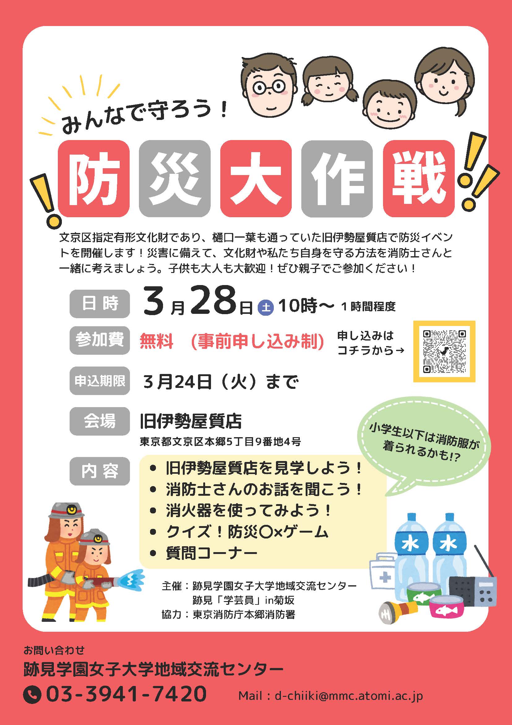 本イベントは、学芸員を目指す学生などが所属する学生チーム【跡見「学芸員」in菊坂】が企画・運営を担当しています。さらに、東京消防庁本郷消防署の協力を得て、実践的な防災体験プログラムも実施します。