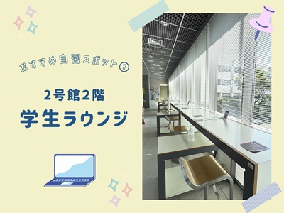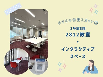私が自習をする時のお気に入りのスペースは、2号館2階の学生ラウンジと2号館8階の2812教室です👍